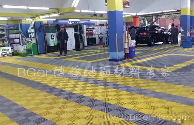 灰色和黃色洗車地面格柵搭配,整體鋪裝大面積汽車保養服務店地面,美觀,整潔,高檔。